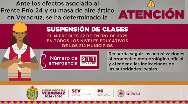 Ante el pronóstico meteorológico que indica la continuación de los efectos del Frente Frío 24 en Veracruz , te compartimos la siguiente información sobre la suspensión de clases en el estado
