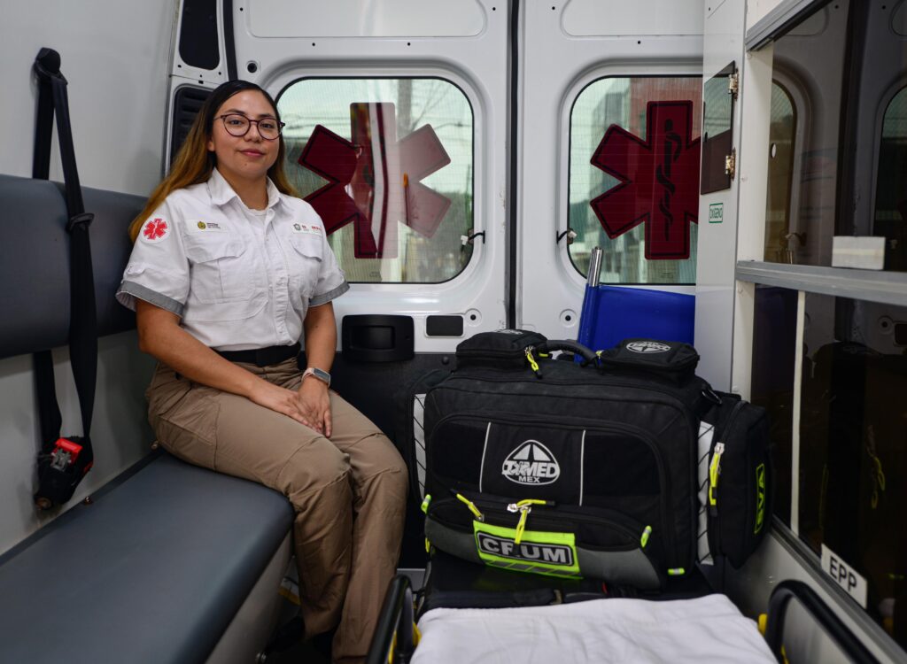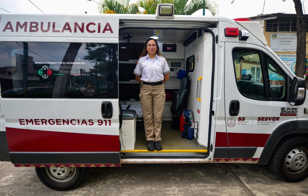 Alejandra Mares Montalvo, enfermera especialista en cuidados intensivos y paramédica, diariamente revisa el equipo médico y mecánico de su unidad antes de salir.