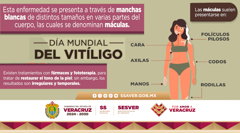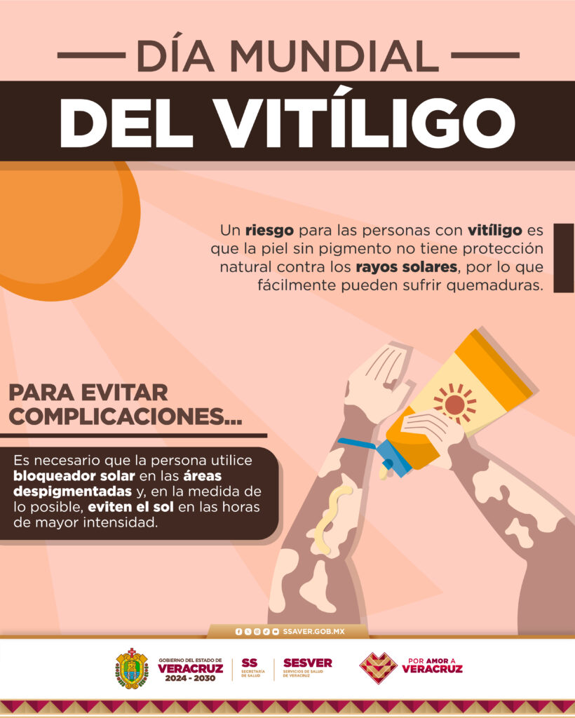 Efemérides Día Mundial del Vitíligo martes 8 de julio de 2025483 Views Un riesgo para las personas con Vitíligo, es que la piel sin pigmento no tiene protección natural contra los rayos solares, por lo que fácilmente puede sufrir quemaduras. Fuente : Secretaría de Salud de Veracruz