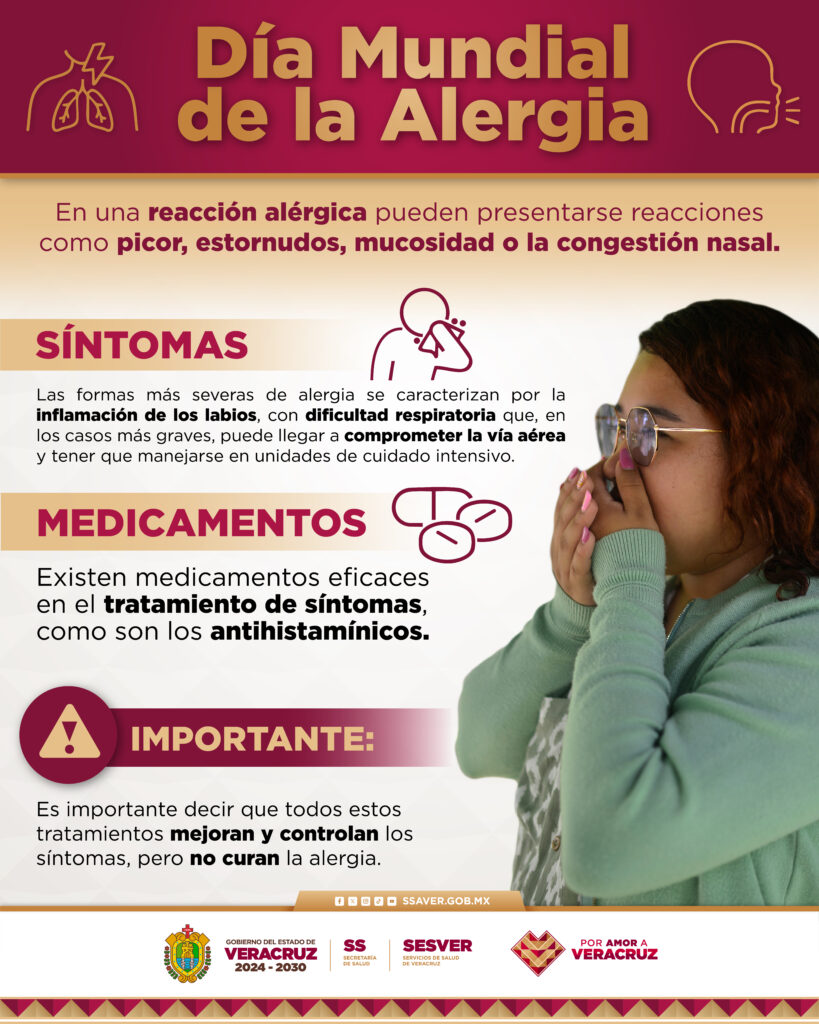 Efemérides Día Mundial de la alergia lunes 11 de agosto de 2025541 Views En una reacción alérgica pueden presentarse reacciones como picor, estornudos, mucosidad o la congestión nasal.