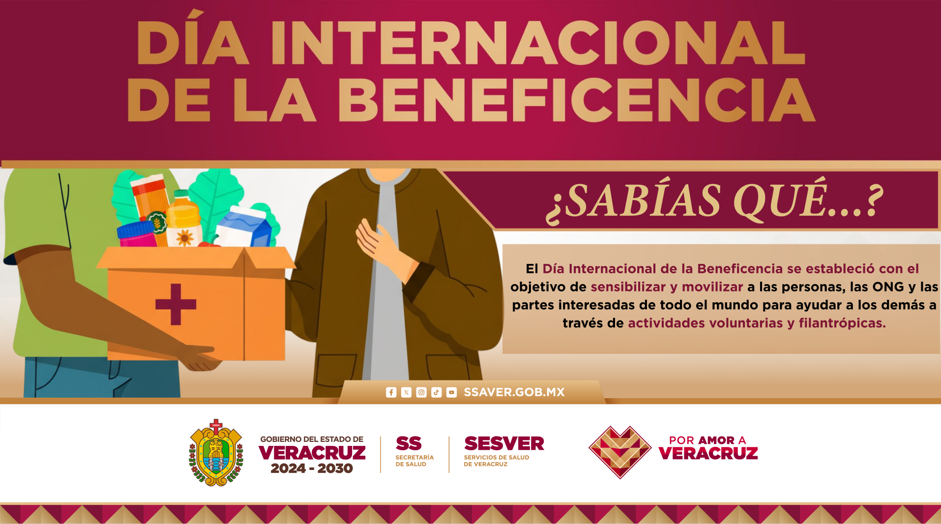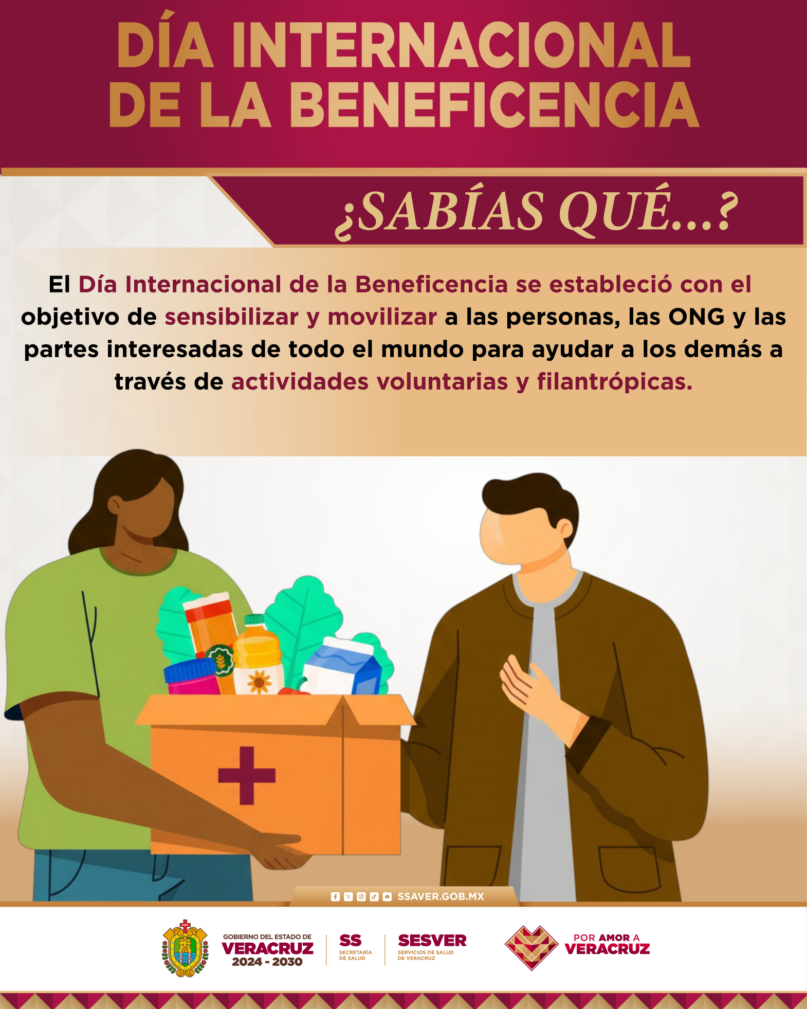EfeméridesGeneralSin categoría 5 de septiembre | Día Internacional de la Beneficencia viernes 5 de septiembre de 2025185 Views Un recordatorio para sumar corazones y voluntades en favor de quienes más lo necesitan. La beneficencia inspira solidaridad, moviliza acciones y transforma vidas. #BeneficenciaPública