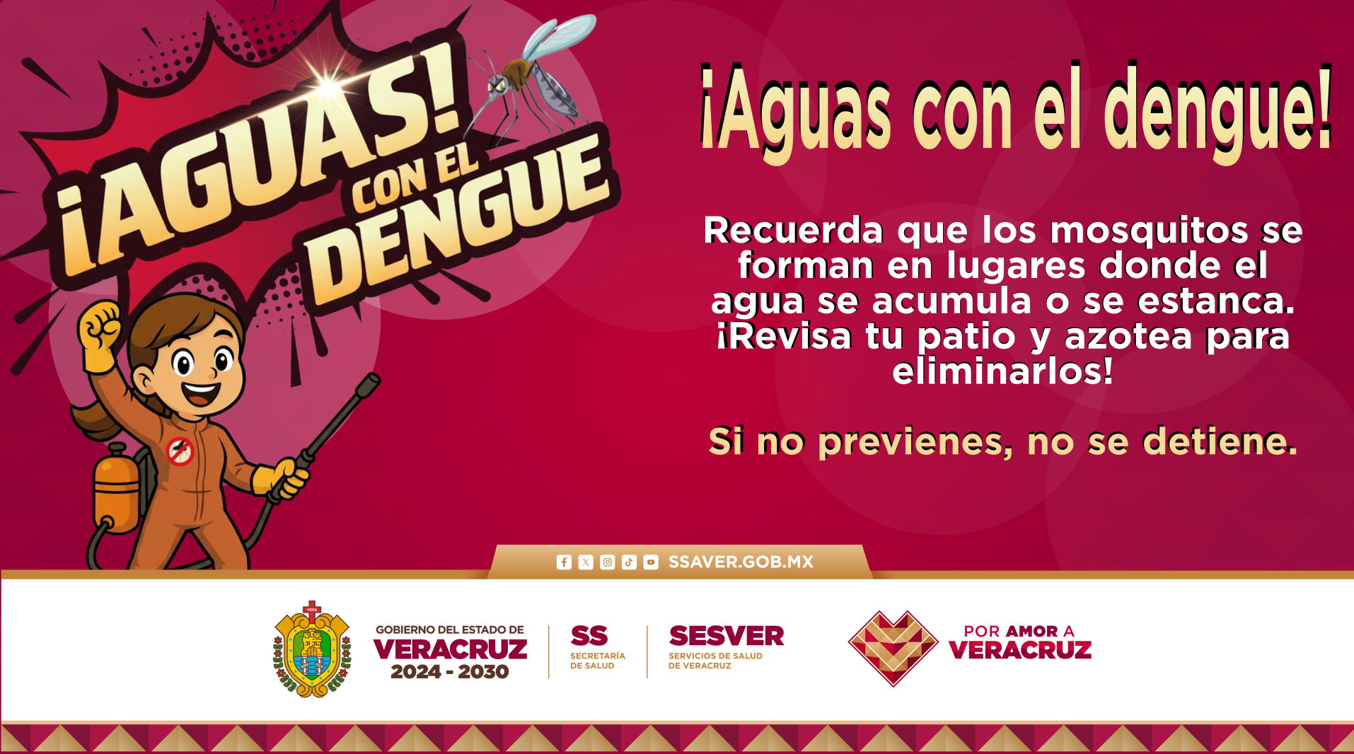 ¡Aguas! con el dengueGeneralPrevención ¡Aguas con el dengue! viernes 3 de octubre de 2025773 Views Recuerda que los mosquitos se forman en lugares donde el agua se acumula o se estanca. ¡Revisa tu patio y azotea para eliminarlos! Si no previenes, no se detiene.