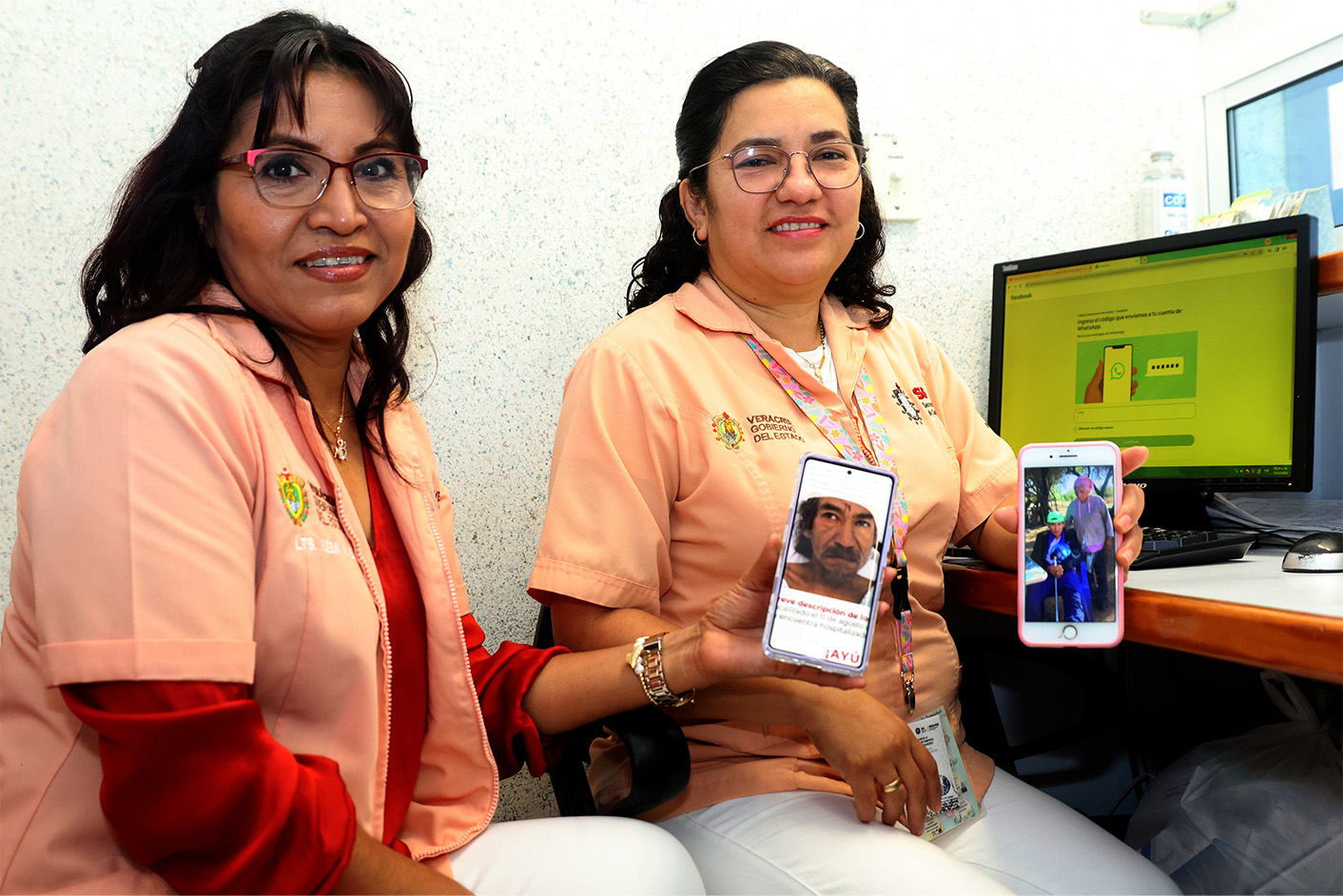 Las trabajadoras sociales del hospital general de Cardel, Noemi Valdivia y Fabiola Santa Maria Hernandez muestran en sus teléfonos las fotos del antes y el después de Manuel Valenzuela ellas fueron las que lograron que regresara a casa después de 16 años extraviado. Foto Jorge Serratos. Secretaria de Salud de Veracruz.