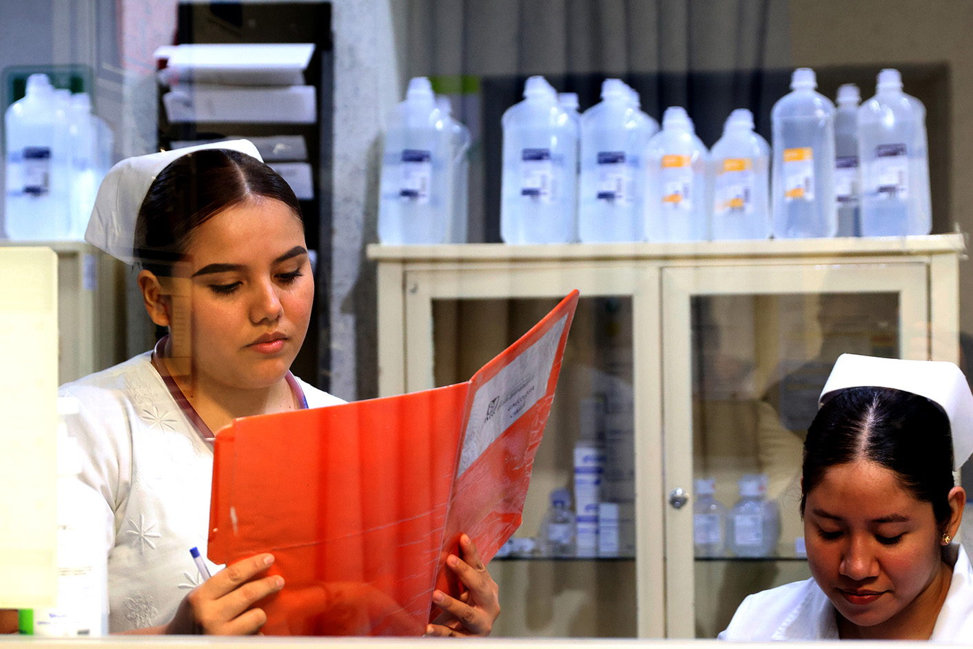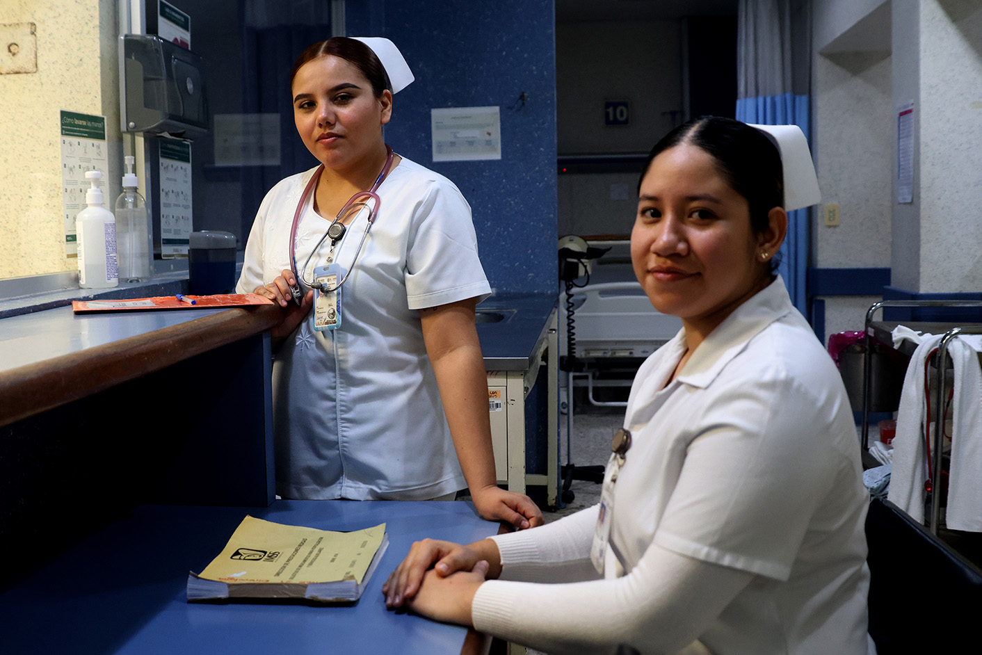 Las pasantes de enfermería Yoselin Rojas y Maria Jose Colorado realizan su trabajo en el hospital general de Cardel, ellas cuidaron de Manuel Valenzuela mejor conocido como “Jack Sparrow”. Foto Jorge Serratos. Secretaria de Salud de Veracruz.