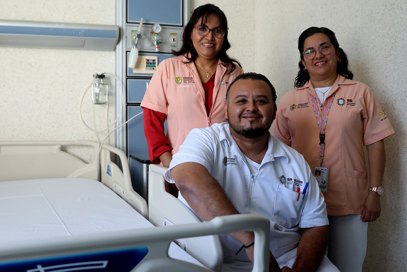 El camillero Jorge Verdejo quien cuido de Black Sparrow posa para la foto con las trabajadoras sociales Noemi y Fabiola, junto a la cama donde estuvo viviendo par más de dos meses Manuel Valenzuela, antes de volver a su natal Tetabiate en Sonora. Foto Jorge Serratos. Secretaria de Salud de Veracruz.