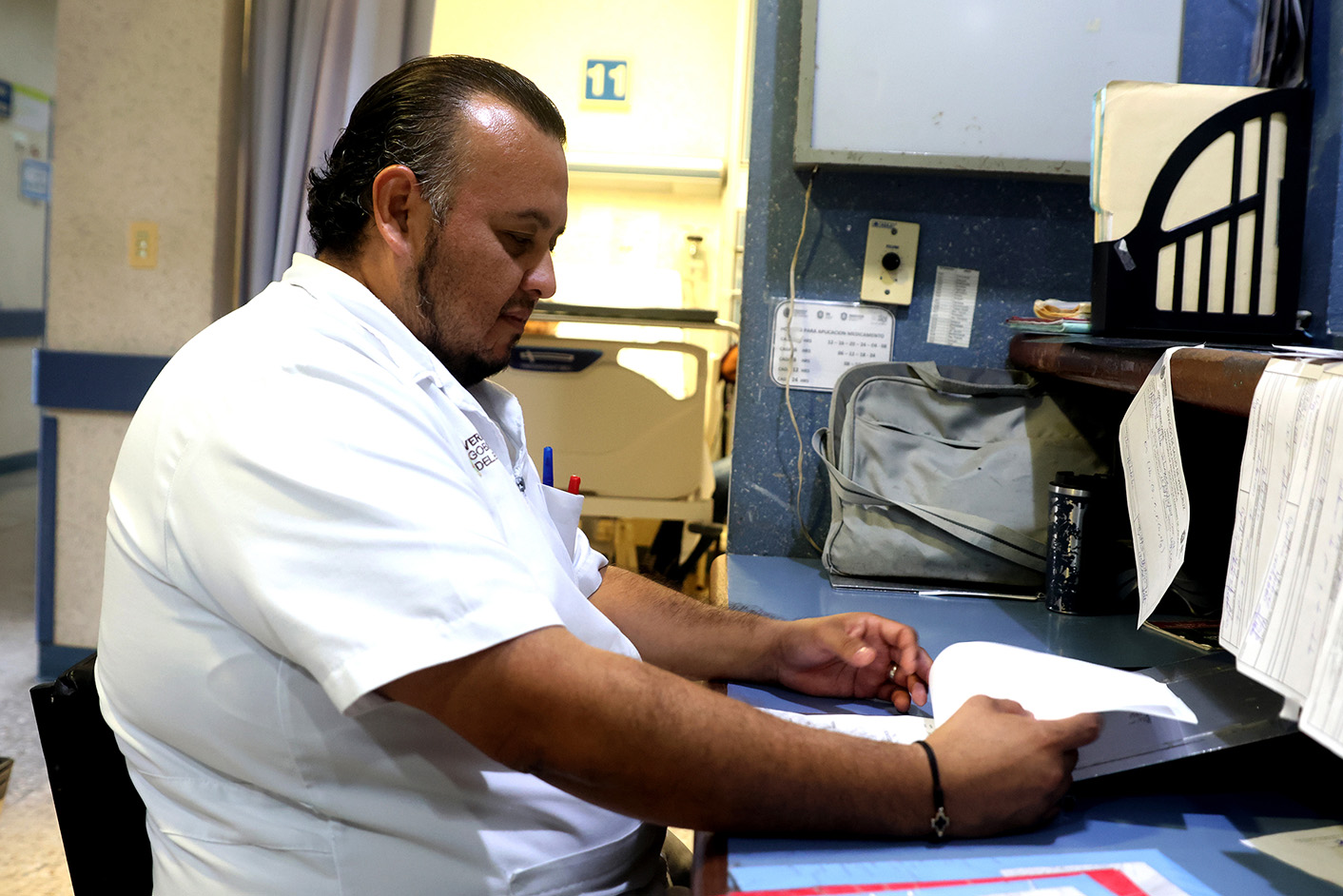 El camillero del hospital general de Cardel, Jorge Verdejo quien ayudo a Manuel Valenzuela en su rehabilitación después del accidente que sufrió, revisa la libreta de las personas que se encuentran internadas. Foto Jorge Serratos. Secretaria de Salud de Veracruz.