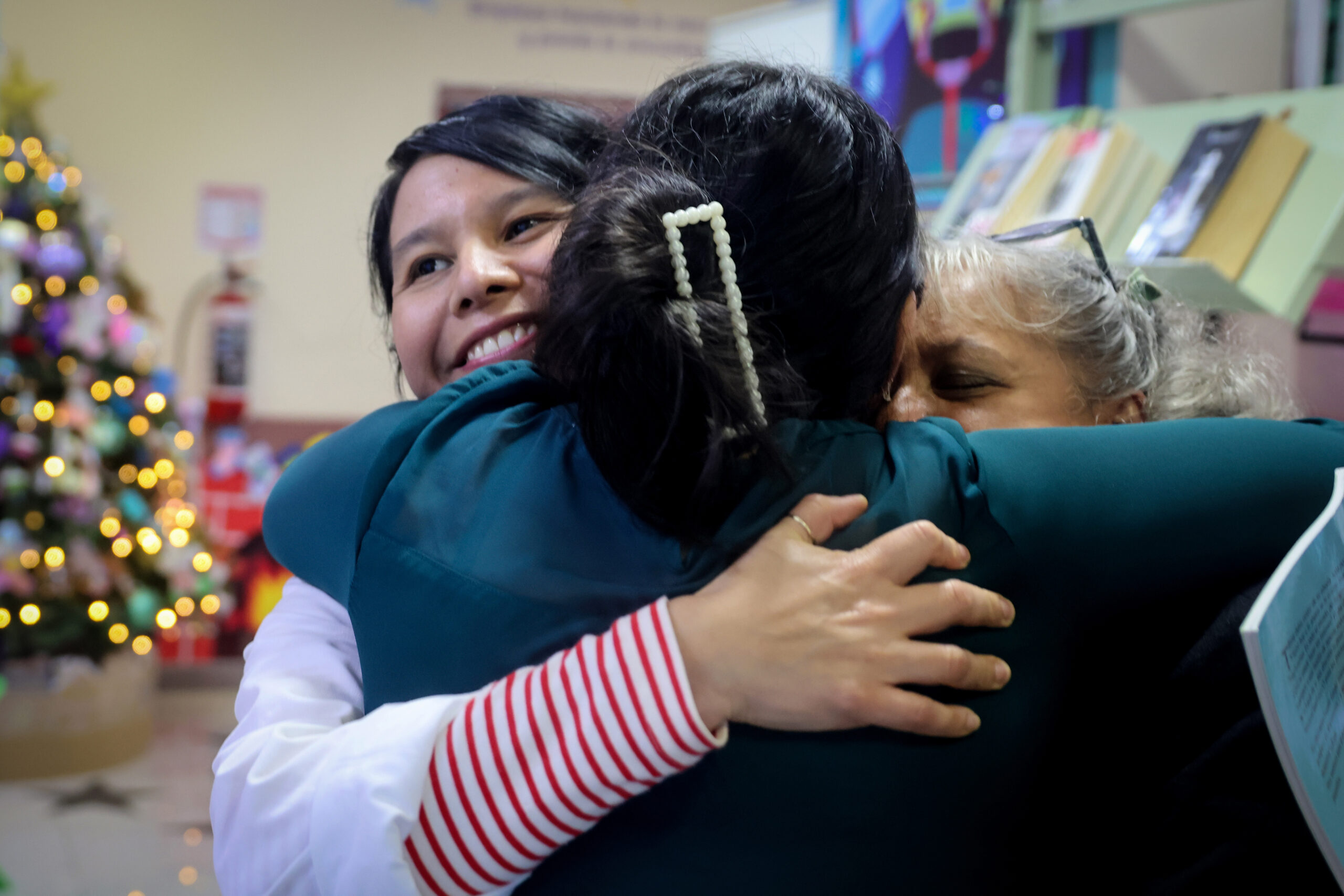 • Magali se da un fuerte abrazo con las sicólogas Isabel Corona y Carmen Gonzalez quienes la atendieron durante su enfermedad. Después de no verse hace más de diez años. Foto Jorge Serratos/Secretaria de Salud.