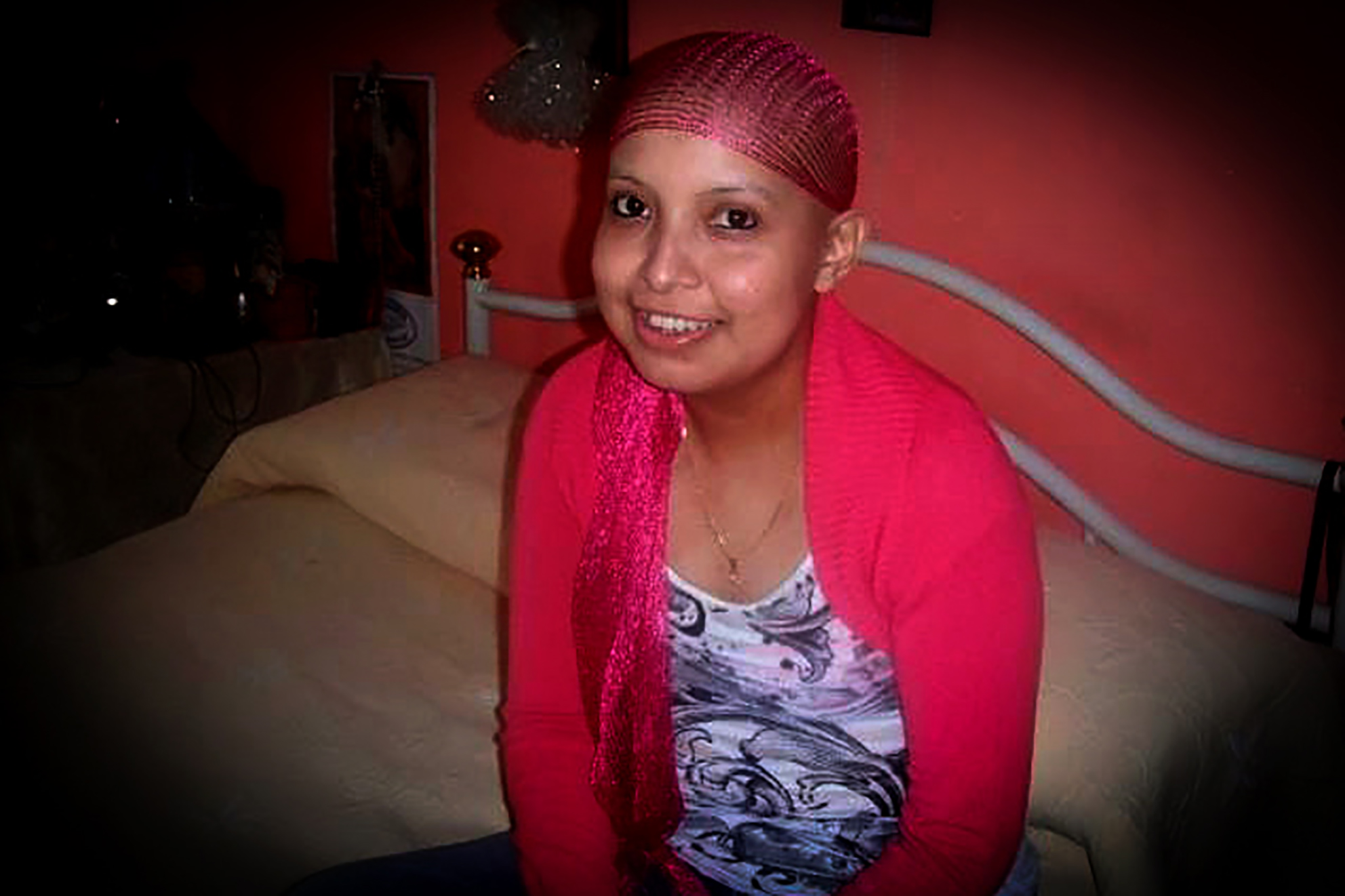 • Magali Martínez posa para la foto en la cama de su casa durante el tratamiento contra el cáncer a sus 17 años de edad cuando se lo diagnosticaron en 2007. Foto Cortesía Magali Martínez.