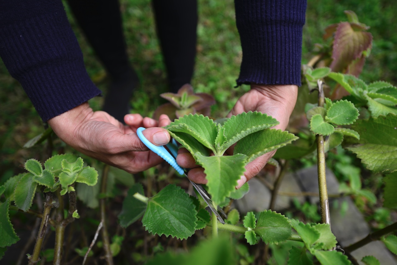 Maestra Georgina Mora Jiménez cortando en el jardín unas hojas de Orégano Orejón. Foto Marco Antonio Pérez Martínez/ Secretaría de Salud.
