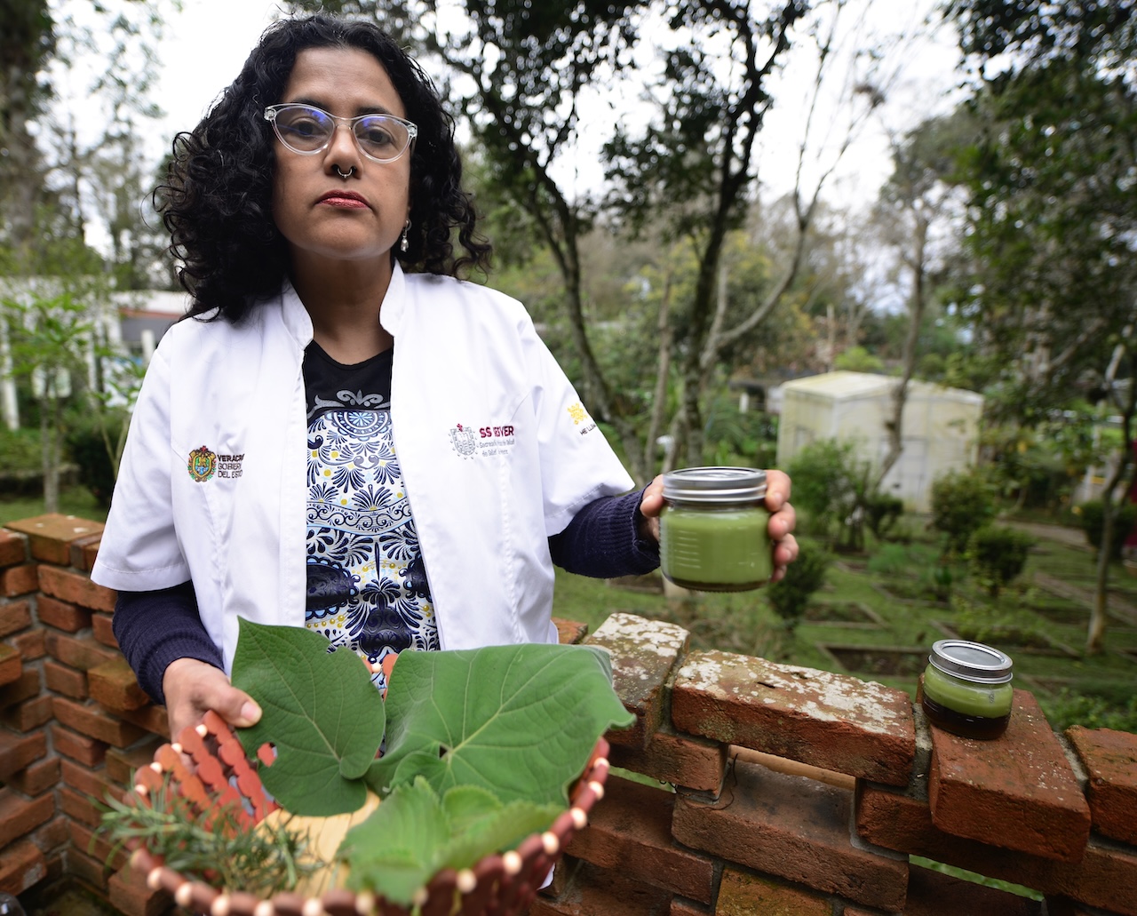 Maestra en ciencias Georgina Mora Jiménez sosteniendo los ingredientes para crear el ungüento. Foto Marco Antonio Pérez Martínez/Secretaría de Salud.
