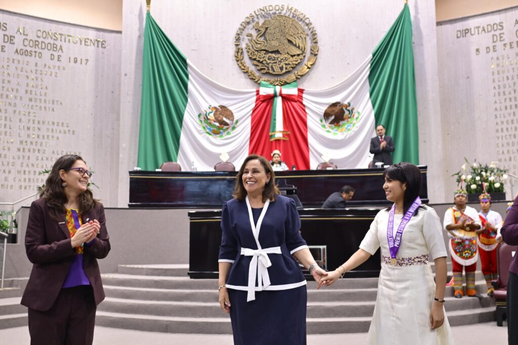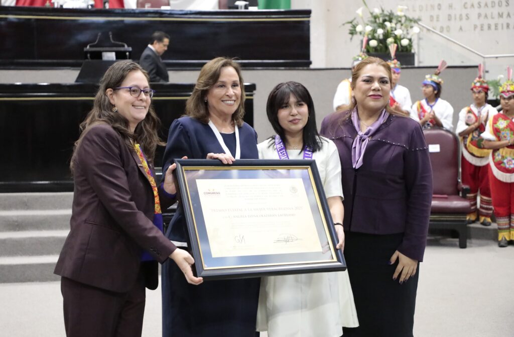 • En sesión solemne del Congreso del Estado, la gobernadora Rocío Nahle García entregó el Premio Estatal a la Mujer a Ángela Elena Olazarán Laureano, joven originaria de Papantla, quien en 2024 fue reconocida con el Global Student Prize como la mejor estudiante del mundo. Foto: Gobierno del Estado
