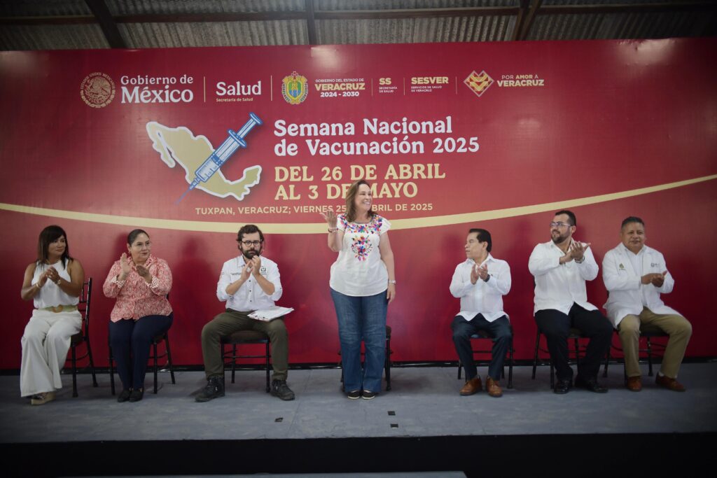 Tuxpan, Ver., viernes 25 de abril de 2025.- La gobernadora Rocío Nahle García y el director general del IMSS-Bienestar, Alejandro Svarch Pérez, encabezaron el arranque de la primera Semana Nacional de Vacunación; resaltaron el trabajo conjunto con diversas instituciones, conforme a la política nacional de prevención impulsada por la presidenta Claudia Sheinbaum Pardo.