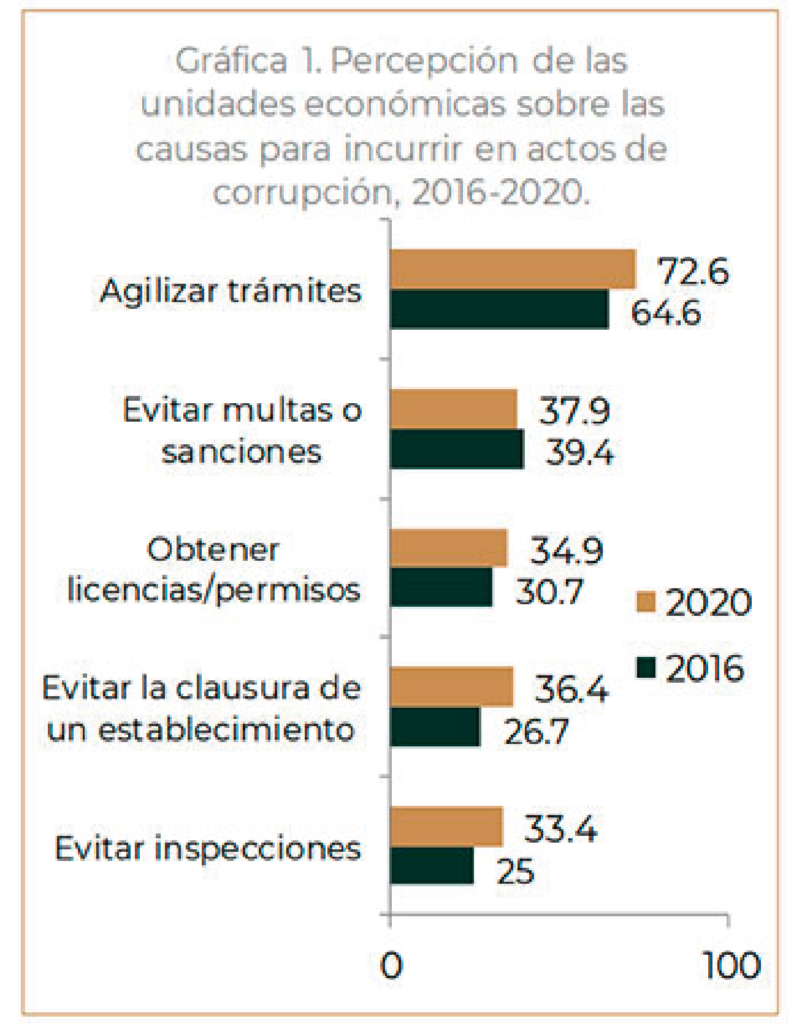 Una de las áreas susceptibles a la complicidad entre el sector público y privado es la regulación. En el caso de México, de acuerdo a la Encuesta Nacional de Calidad Regulatoria e Impacto Gubernamental en Empresas 2016 y 2020 (ENCRIGE) del Instituto Nacional de Estadística y Geografía (INEGI). El sector privado percibe que los actos de corrupción se producen principalmente para agilizar trámites, evitar multas o sanciones, evitar la clausura de un establecimiento, pagar menos impuestos, obtener licencias o permisos y evitar inspecciones (ver gráfica 1).