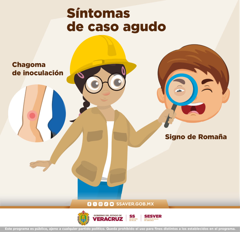 - Fase aguda (dura semanas o meses): puede ser asintomática o presentar fiebre, fatiga, inflamación en el sitio de la picadura, ganglios inflamados, entre otros. En algunos casos se nota un signo visible, como el «signo de Romaña» (hinchazón del ojo).